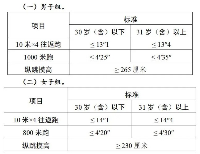 體能測評三項全部達標方為合格。報考緊缺職位的人員,體能測評三項中有二項達標的,視為合格。其中:縱跳摸高的測試次數不超過3次,10米×4往返跑的測試次數不超過2次,1000米跑/800米跑的測評次數為1次。