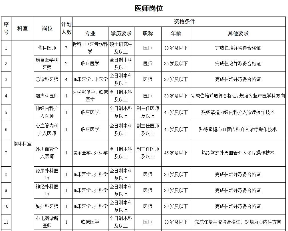 2.條件要求:具備碩士研究生及以上學(xué)歷(部分緊缺專業(yè)可放寬至本科學(xué)歷),年齡不超35歲;專業(yè)理論功底扎實,業(yè)務(wù)技術(shù)過硬,有良好的團隊合作精神;有二級甲等及以上醫(yī)院工作5年及以上經(jīng)歷,并有三級甲等醫(yī)院進修6個月及以上經(jīng)歷。