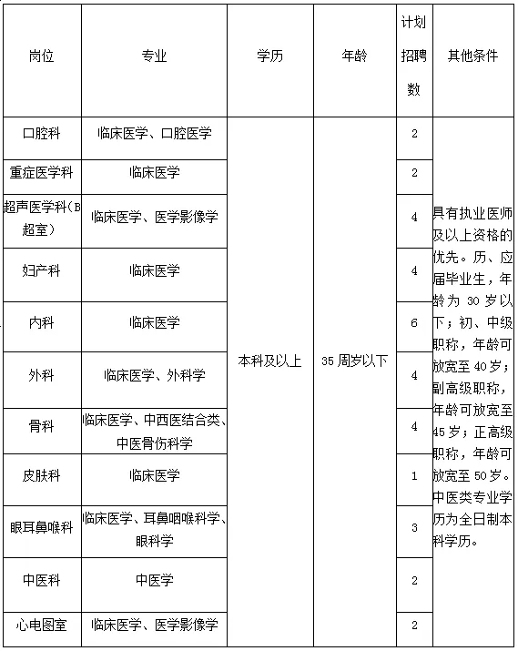 為加快醫(yī)院人才隊伍建設(shè)步伐,優(yōu)化人才隊伍建設(shè),提高人才隊伍素質(zhì),儲備優(yōu)秀衛(wèi)生專業(yè)技術(shù)人才,以滿足我院各科建設(shè)發(fā)展需要。特面向社會公開招聘臨床醫(yī)師。