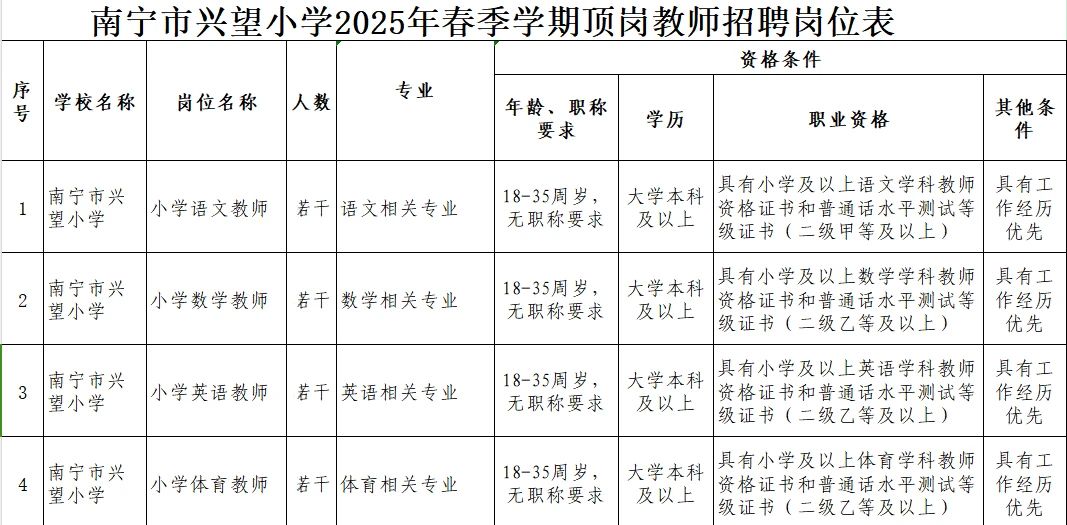 2025年南寧市興望小學春季學期頂崗教師招聘公告