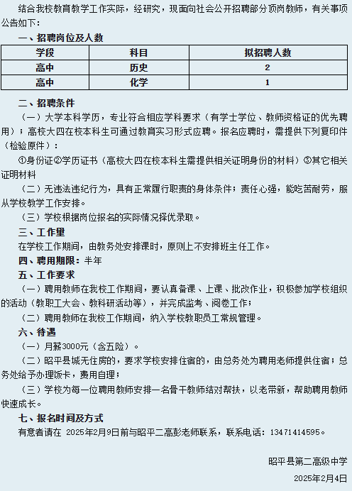 2025年昭平縣第二高級中學春季學期招聘頂崗教師公告