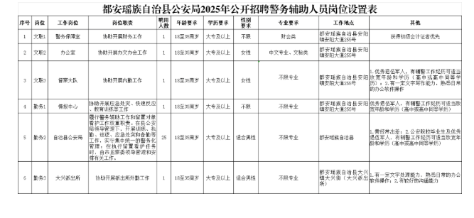 都安瑤族自治縣公安局本次擬招聘警務輔助人員30人,具體招聘崗位、人數(shù)、資格條件詳見《都安瑤族自治縣公安局2025年公開招聘警務輔助人員崗位設置表》