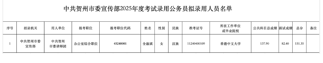 根據(jù)《廣西壯族自治區(qū)2025年度考試錄用公務員公告》要求,經(jīng)過公開報名、資格審查、筆試、面試、體檢、考察等程序,確定全淑琪1名同志為擬錄用公務員,現(xiàn)予以公示。公示期為2025年6月6日至6月12日(5個工作日)。如對擬錄用人員有異議,請在公示期內向中共賀州市委宣傳部實名反映。
