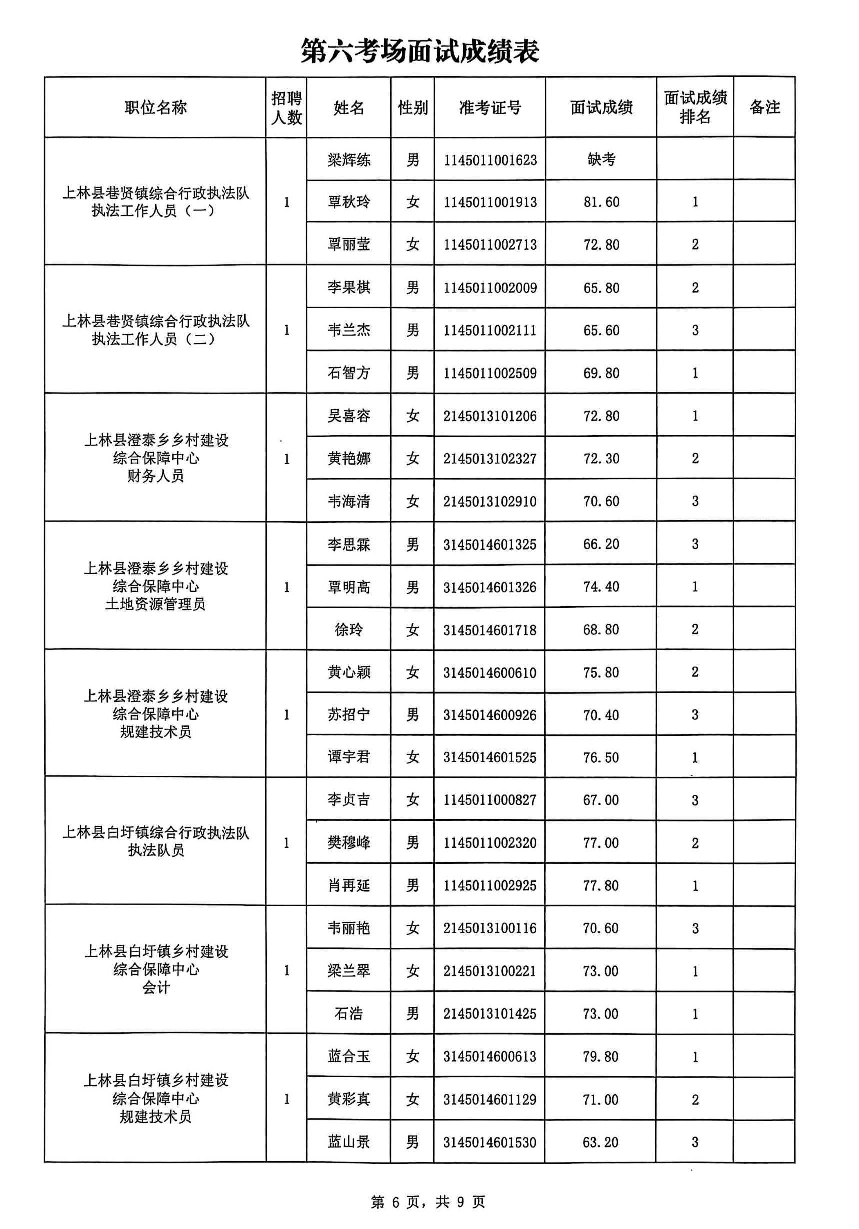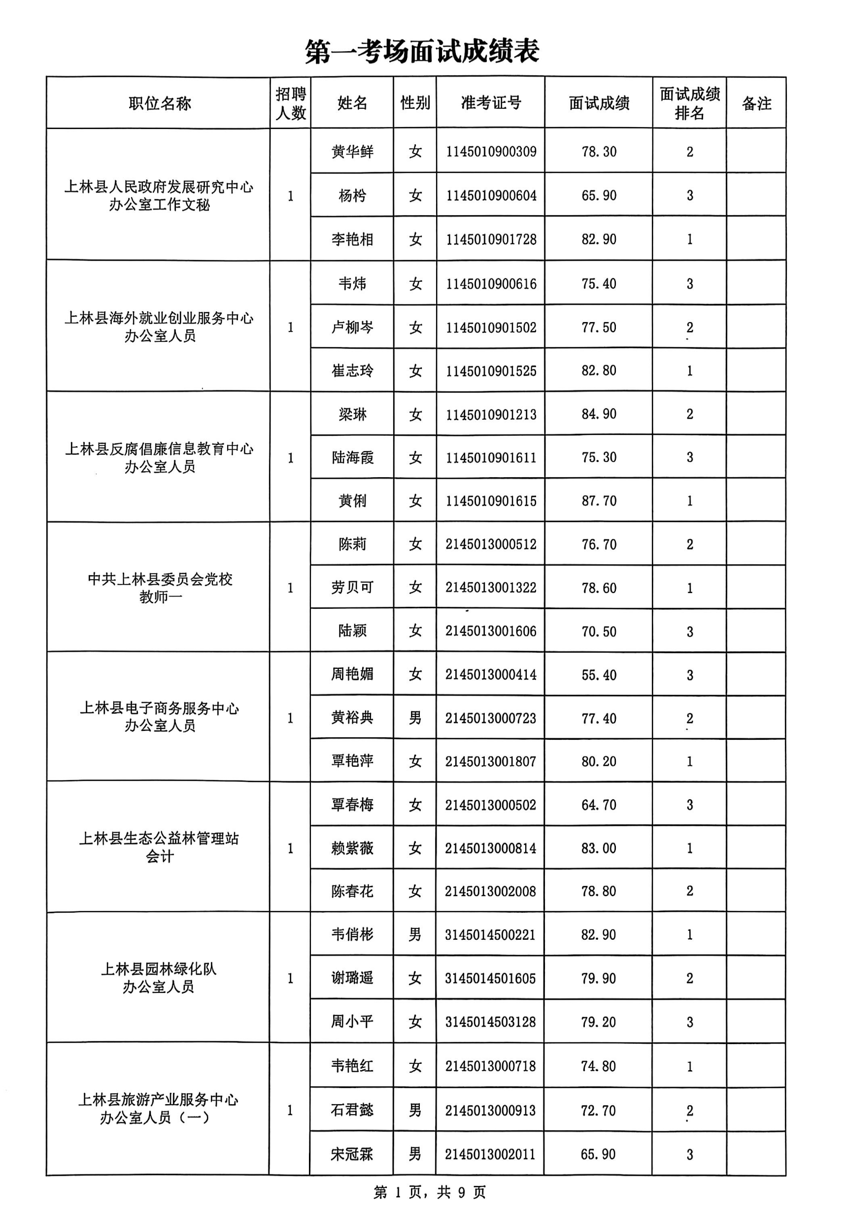 上林縣2025年公開(kāi)考試招聘事業(yè)單位工作人員面試成績(jī)