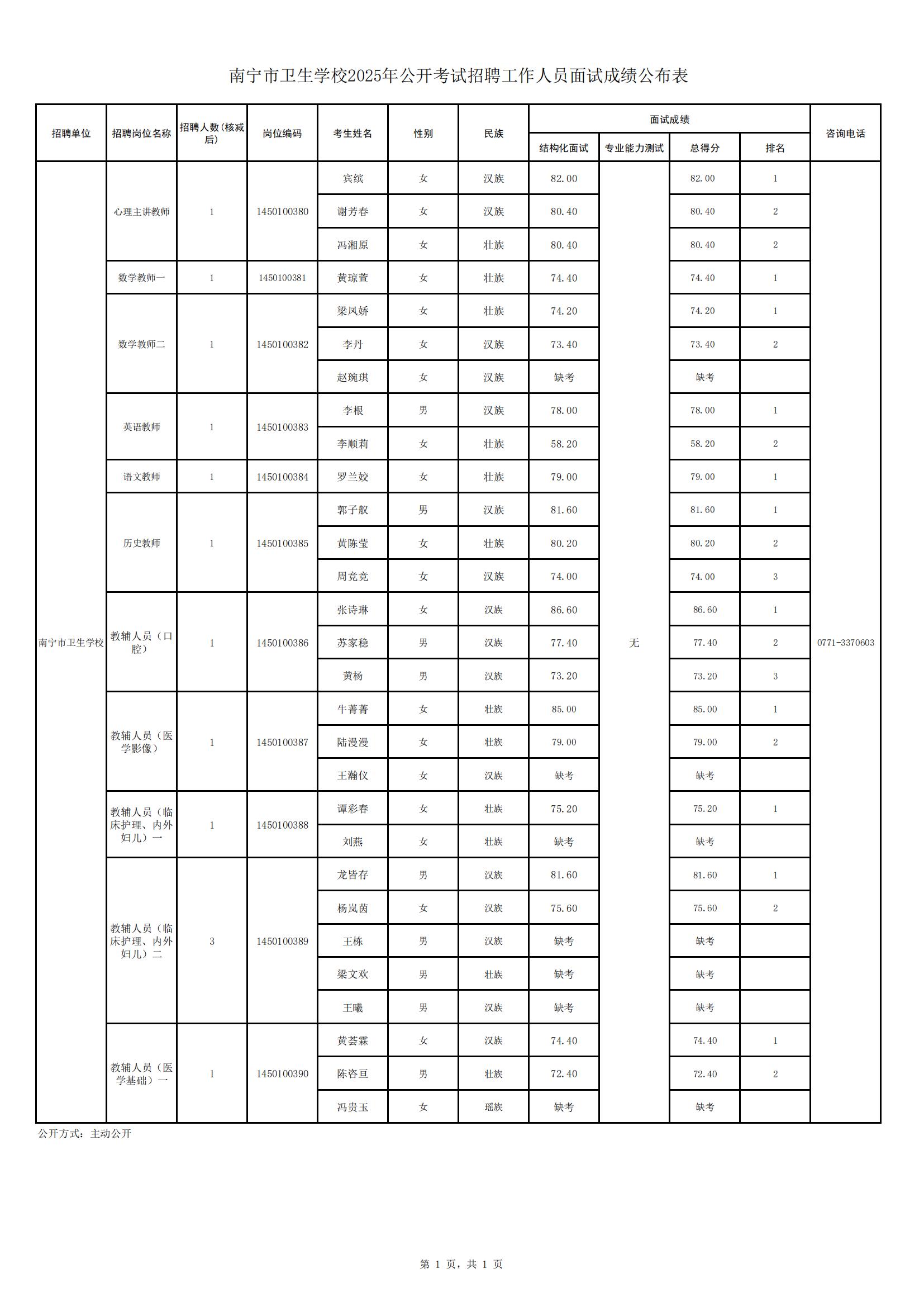 南寧市衛(wèi)生學(xué)校2025年公開(kāi)考試招聘工作人員面試成績(jī)公布表