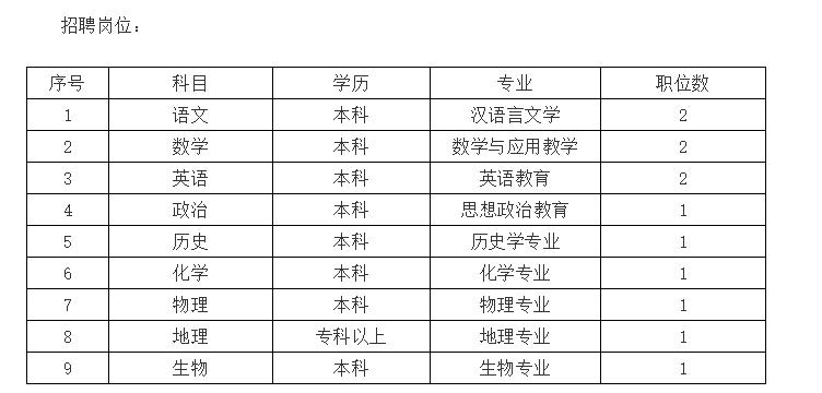 招聘條件:遵守國家法律、法規(guī),師德良好,服從管理,服從安排,教風(fēng)嚴(yán)謹(jǐn),為人正直,事業(yè)心和責(zé)任心強(qiáng),本科及以上學(xué)歷,普通話流暢、準(zhǔn)確,富有愛心,有志從事教育事業(yè),有一定的管理和人際協(xié)調(diào)能力,學(xué)業(yè)成績優(yōu)秀的應(yīng)、歷屆師范院校或同等學(xué)歷的其他院校畢業(yè)生,有多年從教經(jīng)驗(yàn)的教師可適當(dāng)放寬年齡優(yōu)先聘用。