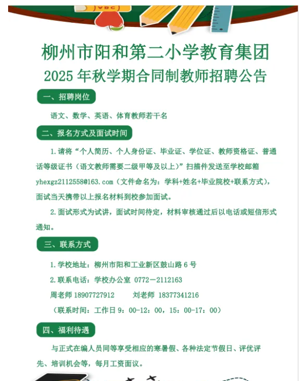 2025年柳州市陽(yáng)和第二小學(xué)教育集團(tuán)秋學(xué)期合同制教師招聘公告
