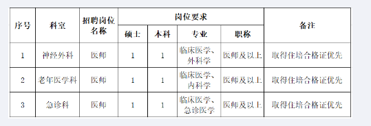 根據(jù)醫(yī)院發(fā)展需要,現(xiàn)面向社會急招神經(jīng)外科、老年醫(yī)學(xué)科、急診科醫(yī)師,有關(guān)招聘事項(xiàng)公告如下: