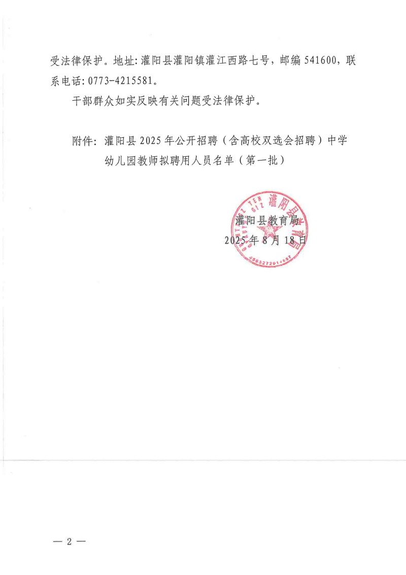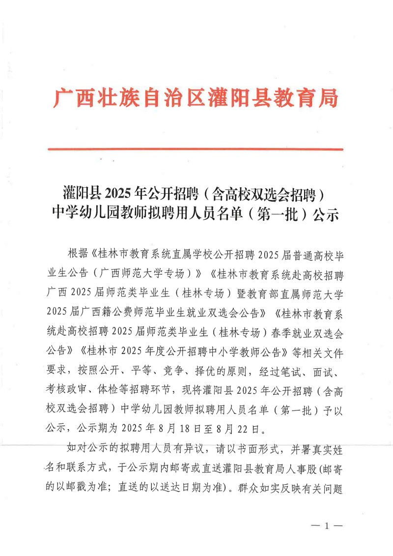 灌陽(yáng)縣2025年公開(kāi)招聘(含高校雙選會(huì)招聘)中學(xué)幼兒園教師擬聘用人員名單(第一批)公示