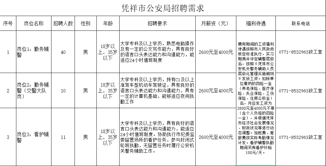 (二) 報(bào)名地點(diǎn)憑祥市公安局(憑祥市北大路69號(hào))報(bào)名及咨詢電話:0771-8532963報(bào)名投簡歷郵箱:pxgazgs@163.com報(bào)名請附上身份證復(fù)印件、學(xué)歷畢業(yè)證書復(fù)印件
