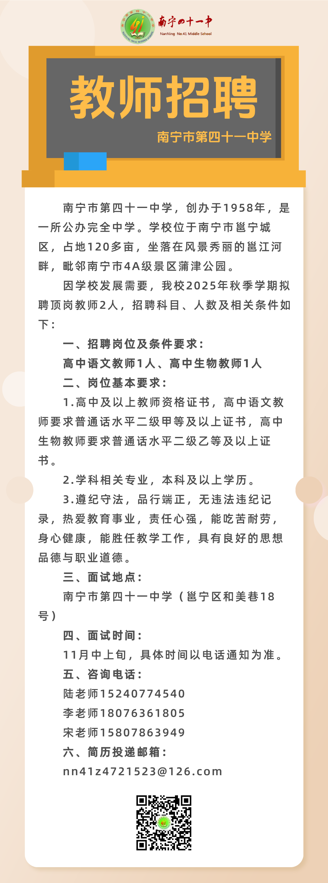 2025年秋季學期南寧市第四十一中學關于公開招聘頂崗教師的啟事