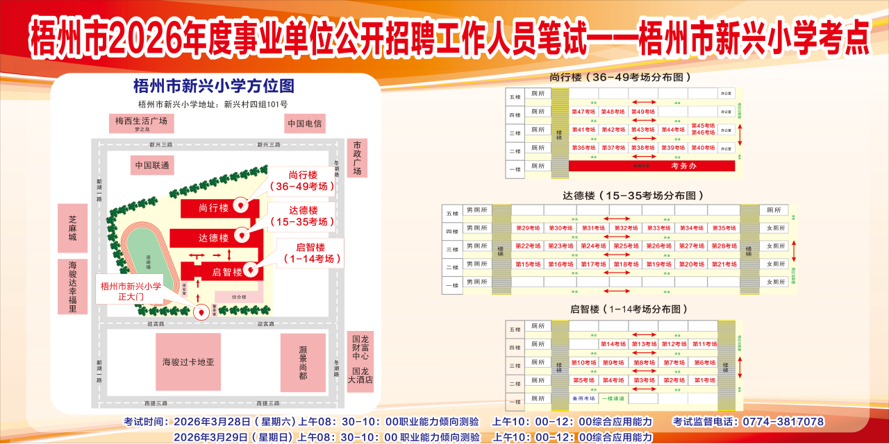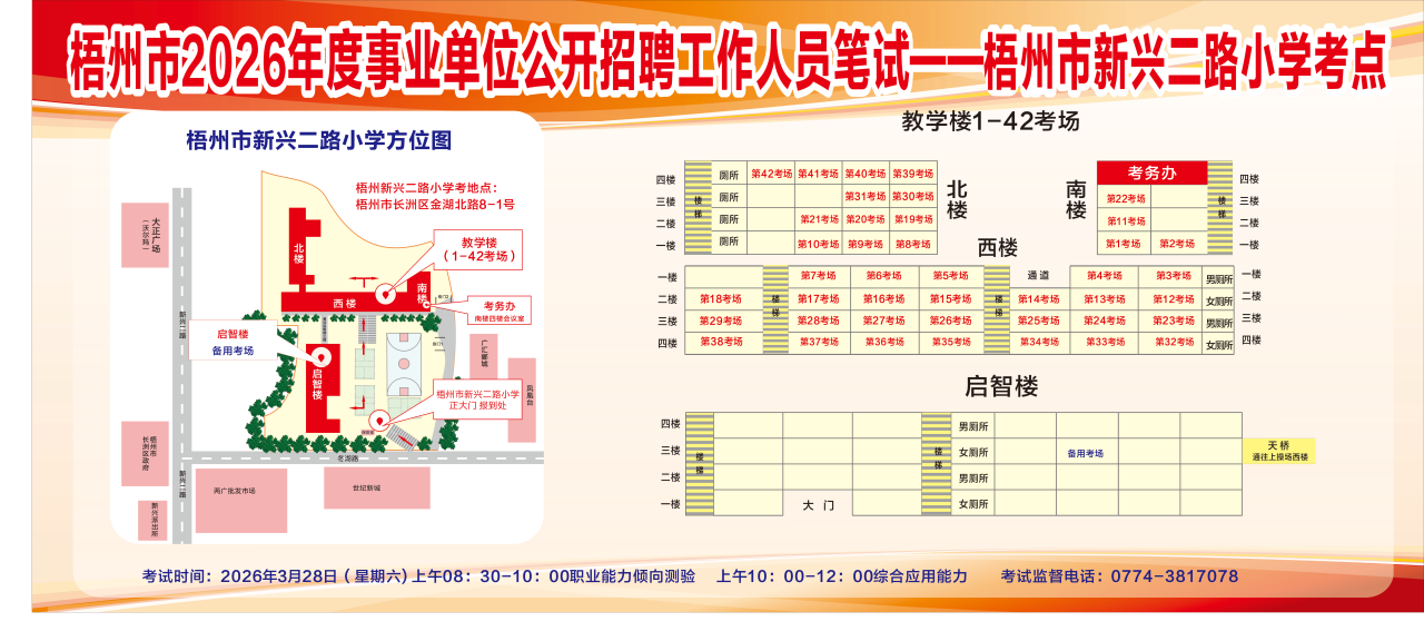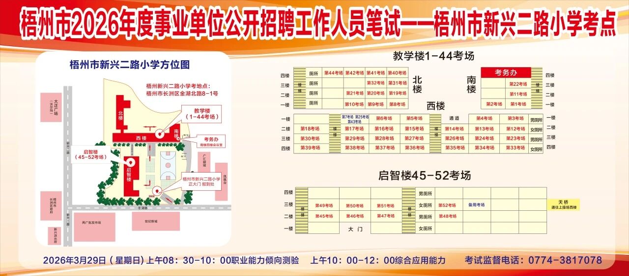 請考生提前熟悉各自考點(diǎn)位置、周邊環(huán)境及交通情況,考試當(dāng)天提前出門做好準(zhǔn)備,準(zhǔn)時(shí)參加考試。特別提示:因考點(diǎn)停車場地有限,所有考生車輛不得進(jìn)入考點(diǎn),請考生規(guī)劃好前往考點(diǎn)的交通方式和路線。此外,萬秀區(qū)西堤二路新華路口至豐業(yè)藍(lán)天港灣段、長洲區(qū)西堤三路梧州市人力資源和社會(huì)保障局至奧奇麗路口段道路實(shí)施臨時(shí)交通管制措施,如果考生通往考點(diǎn)途經(jīng)此路段,請?zhí)崆耙?guī)劃路線和出行時(shí)間。