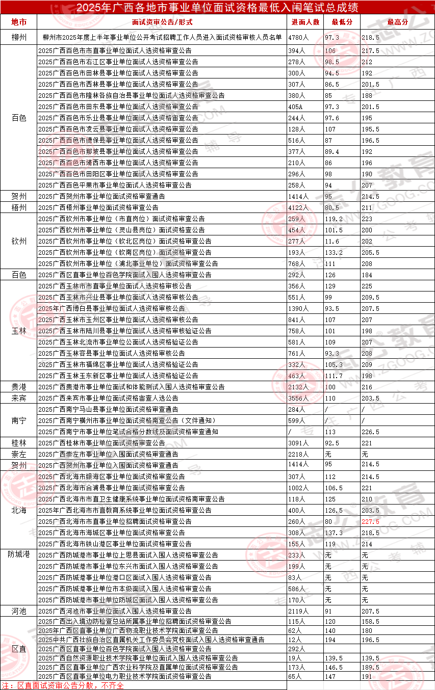 為了讓大家更直面廣西25年上半年事編聯(lián)考的進(jìn)面分情況,廣西志公教育還根據(jù)官方給出的進(jìn)入面試范圍人選zui低筆試總成績,給大家整理了除了部分區(qū)直單位之外的區(qū)直單位、14地市事業(yè)單位zui低、zui高入面分。