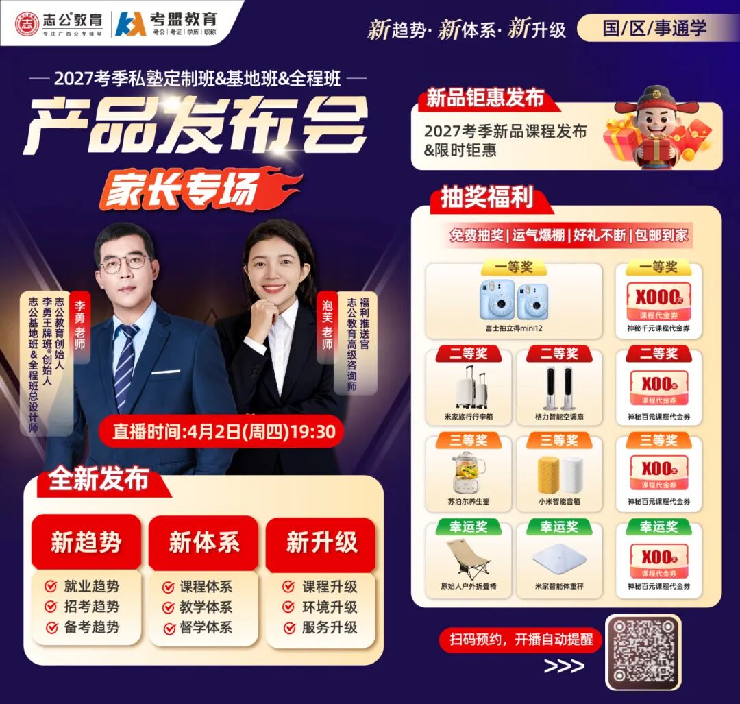 面對(duì)孩子棘手的就業(yè)與考公難題,家長(zhǎng)們往往深感無(wú)力。針對(duì)這一系列關(guān)切的痛點(diǎn),志公教育于4月2日(周四)19:30舉辦“新趨勢(shì)·新體系·新升級(jí)——2027考季公考產(chǎn)品發(fā)布會(huì)”重磅直播,從專(zhuān)業(yè)的角度分析解讀當(dāng)前就業(yè)、招考、備考的新趨勢(shì),為廣大學(xué)子及家長(zhǎng)送上備考的“及時(shí)雨”,滿足家長(zhǎng)和學(xué)子們對(duì)獲得更優(yōu)質(zhì)的學(xué)習(xí)環(huán)境、課程體系、督學(xué)服務(wù)、教學(xué)成果的期待。同時(shí)直播間免費(fèi)送出更多超值福利。