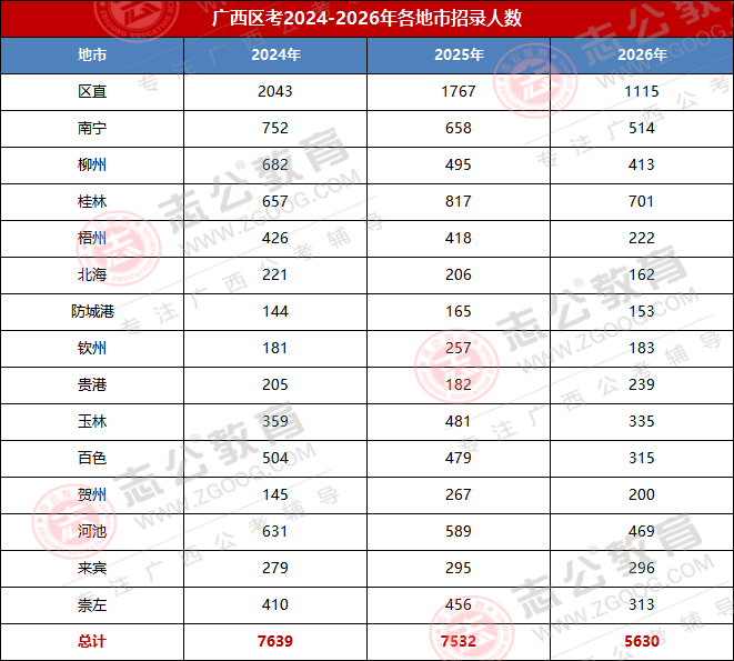 2026廣西區(qū)考招錄人數(shù)較去年大幅度減少,2026年招錄公告,本次區(qū)考計劃招錄總人數(shù)為5630人,較2025年的7532人減少1902人,同比降幅達25.25%,是近年招錄規(guī)模收縮幅度較大的一年。