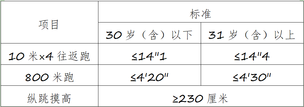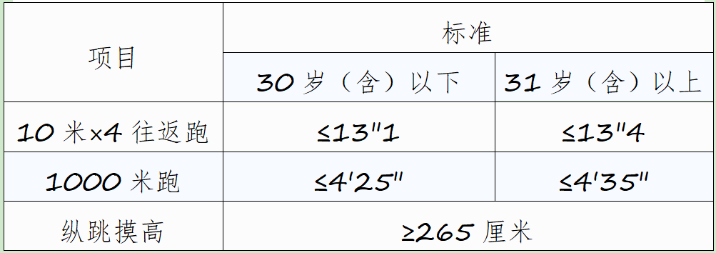 年齡計算時間截止到參加體能測評當月。體能測評項目中,10米×4往返跑項目每人最多可測2次,男子1000米跑(女子800米跑)項目每人最多可測1次,縱跳摸高項目每人最多可測3次。1次測評達標,即視為該項目測評合格。體能測評所需的場地環(huán)境和器材,結(jié)合測評地點的實際情況設置。